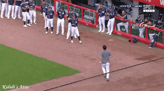 두산-기아전 홍건희 송별 행사 때 홍상삼의 친정팀 더그아웃 방문. ㅋ