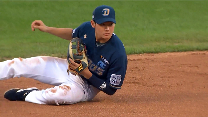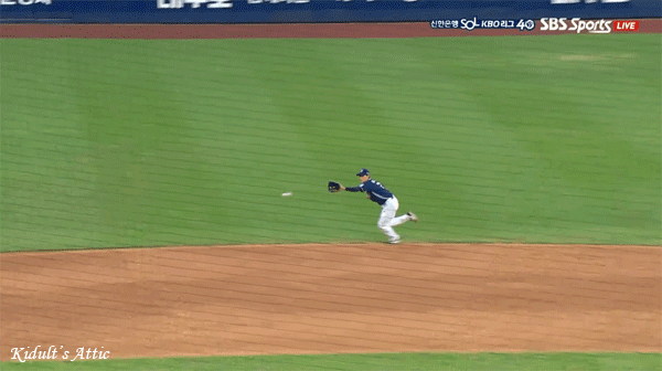 빠져나갈뻔한 타구를 잡자마자 앉은 자리에서 회전하면서 2루에 송구-> 주자 아웃.